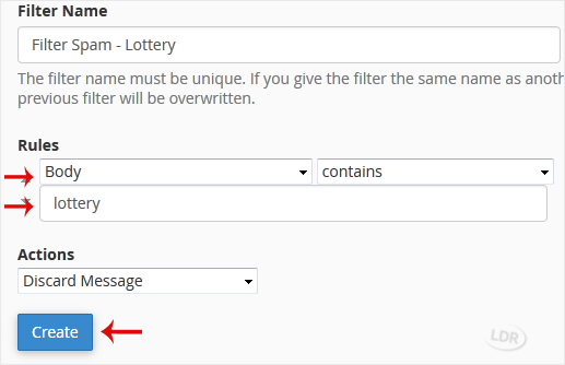 5. The filter rules come with many options for filtering email. Should you want to deal with an email that contains a word such as Lottery or any other words, select Body in the first list box and select Contains in the second one.